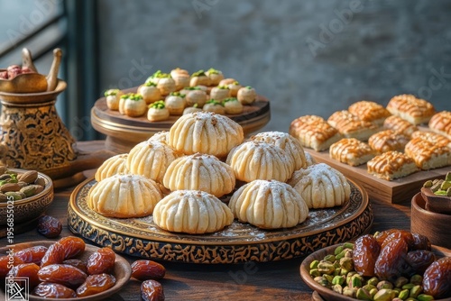 Powdered stuffed shortbread cookies on an ornate tray surrounded by dates, pistachios, small nut-topped pastries and a brass coffee pot on a warm wooden table, inviting and festive