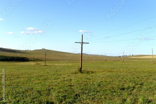 Power line in the foothills of the Altai territory. Western Siberia. Russia
