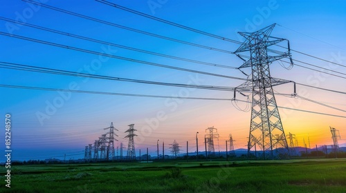 power, line, sunset, sky, field, grass, electric, tower, energy, wire, grid, transmission, infrastructure, rural, landscape, horizon, orange, pink, purple, blue, steel, structure, support, tall, strong, light, evening, twilight, gold, nature, ground, green, metal, silhouette, industrial, electricity