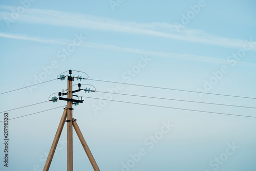 Power lines on background of blue sky close-up. Electric hub on pole. Electricity equipment with copy space. Wires of high voltage in sky. Electricity industry.