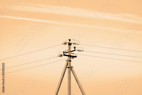 Power lines on background of sky close-up. Electric hub on pole in monochrome. Electricity equipment with copy space. Wires of high voltage in sky. Electricity industry. Sepia tone.