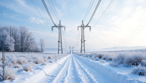 powerline, winter, snow-covered, landscape, frosted, outdoors, nature, energy, rural, transmission tower, scenic, cold, calm, electricity, infrastructure, winter landscape, industrial
