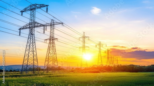 power, line, sunset, sky, electricity, landscape, nature, energy, transmission, tower, horizon, sunlight, cable, field, rural, silhouette, cloud, bright, summer, outdoors, serene, scenic, beauty, environment, technology, renewable, infrastructure, geography, scenic view, calmness, evening, dusk, vibrant, warm, evening sky, dark clouds, rural area, electric, grid, network, illumination, wind, scenery, sunny