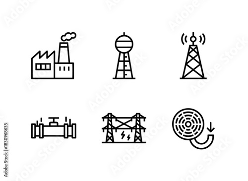 power, plant, water, tower, communication, gas, pipeline, electrical, grid, minimal, bold, line, icon, set, industry, energy, utility, visual, asset, concept, symbol, infrastructure, system, network, service, electric, clean, resource, building