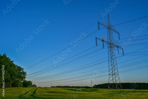 Power poles in spring on the field and meadow, Brandenburg, Germany
