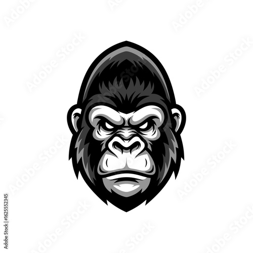 gorilla, ape, primate, mammal, animal, head, portrait, black, white, greyscale, monochrome, illustration, vector, graphic, design, strong, powerful, intense, serious, focused, wildlife, nature, icon, logotype, symbol, masculine, fierce, determined, aggressive, stare, expression, and, art, face