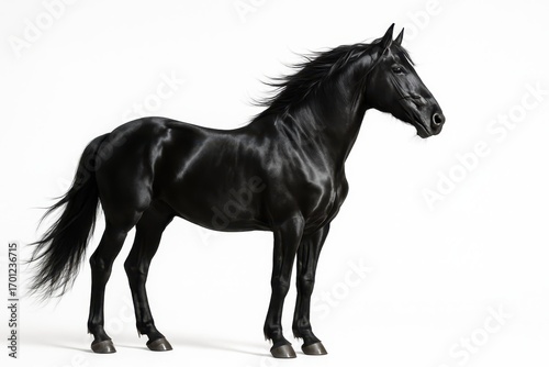 Powerful black stallion studio portrait isolated on pristine white high key background dynamic mane sharp detail elegant equine cutout for premium design and advertising