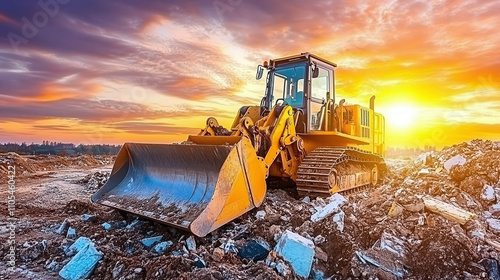 Powerful bulldozer moving earth and debris on a construction site during a vivid sunset, showcasing industrial machinery and rugged landscape.