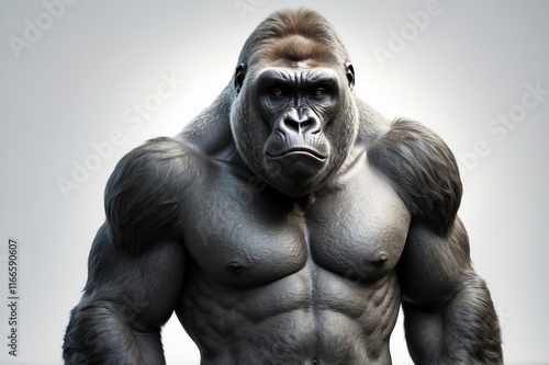 gorilla, ape, primate, animal, mammal, strong, powerful, muscular, muscle, body, beast, wildlife, wild, nature, jungle, forest, portrait, closeup, face, head, eye, hair, fur, silverback, majestic, intense, serious, looking, gaze, background, grey, studio, photo, image, picture, graphic, design, illustration, artwork, art, macho, male, anatomy, figure, torso, chest, shoulder