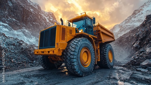 truck, mining, mountain, heavy, machinery, vehicle, construction, industry, quarry, shoveling, transport, equipment, engineering, powerful, massive, industrial, haulage, dump truck, offroad, terrain, rock, hill, landscape, stone, gravel, extraction, yellow, sunset, sky, cloud, nature, work, job, career, operation, heavy duty, transporting, large, giant