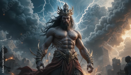 warrior, mythology, thunder, storm, sky, cloud, powerful, strong, muscular, king, nature, fantasy, dramatic, ancient, battle, force, energy, heroic, lightning, regal, art, character, emotion, courage, strength, epic, silhouette, magic, tension, creativity, legend, atmosphere, intense, sculpture, titan, grandeur, leadership, pose, inspiration, essence, bravery, adventure, stormy, conflict, representation