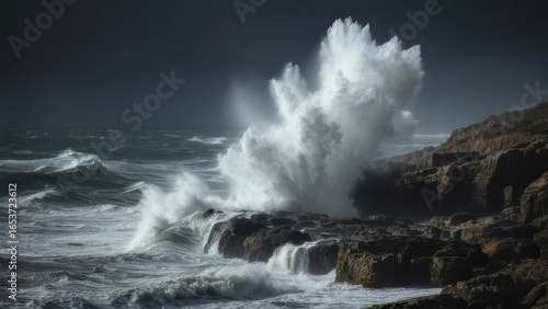 wave, ocean, shore, rocky, powerful, crashing, storm, water, sea, spray, white, dark, dramatic, cloud, sky, grey, foamy, nature, wild, majestic, coastal, rock, coast, turbulent, oceanic, violent, wave, foam, waterfall, coastline, cliff, wind, crash, sea, huge, stunning, beauty