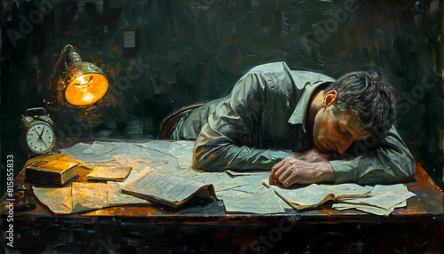 Powerful Portrayal of Fatigue: Weary Figure Slumped Over Desk. Non-existent person.