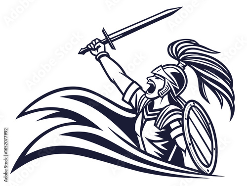 warrior, soldier, sword, shield, armoring, helmet, battle, strength, power, history, fantasy, mediaeval, video game, illustration, graphic, black-and-white, red, white, strong, dynamic, action, design, logotype, character, closeup, vintage, vector, combat, defense, attack, prepared, inspired, hero, epic, military, historical, branding, emblem, art, design element, graphic design, powerful