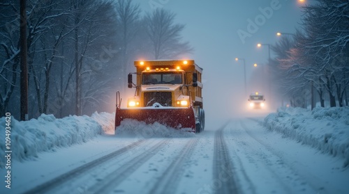 snowplough, clearing, snow, winter, town, road, heavy, storm, powerful, transportation, machinery, winter storm, vehicle, blizzard, icy, cold, weather, severe, plowing, street, removal, driving, safety, urban, equipment, snowy, maintenance, truck, rugged, frost, city, hard, harsh, visibility, light, hazard, stormy, condition, operation, service, men at work, flurry, chill, dusk, infrastructure, winterly