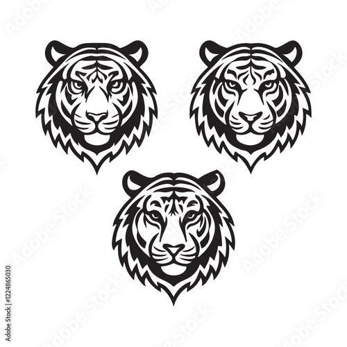tiger, animal, wildlife, graphic design, logotype, black-and-white, monochrome, vector, illustration, design element, print, stencil, tattoo, strong, powerful, fierce, wild, nature, predator, stripes, eye, face, closeup, minimalist, bold, majestic, modern, vintage, silhouette, decorative, art, design, template, apparel, fashion, poster, background, animal head, conservation, environment, symbol