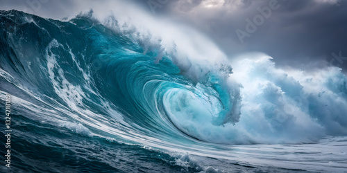 powerful wave crashing with vibrant blues and whites, showcasing nature force