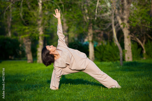 Practicing yoga in the morning, with trees background