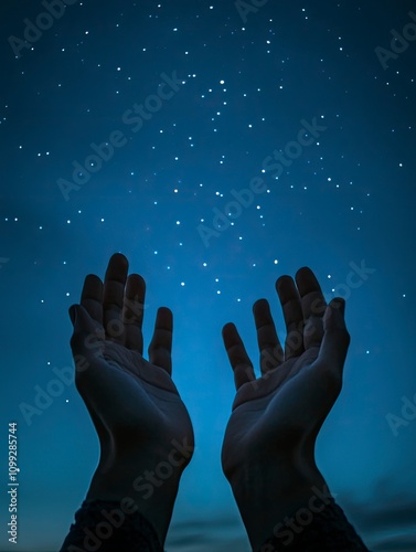 Praying muslim, hands open to the sky in the holy night. Social media story, vertical
