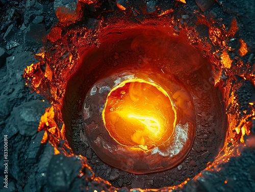Precious metal in forge, glowing and hot, top view, representing transformation, futuristic tone, vivid