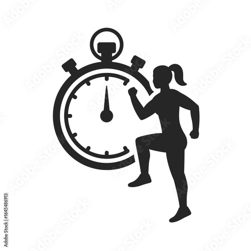 Precision in Fitness: A silhouette of a woman strides purposefully towards a stopwatch, embodying the fusion of fitness, time management, and a commitment to reaching peak condition.