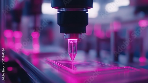Precision Manufacturing: Close-up of Advanced CNC Machine with Pink Illumination