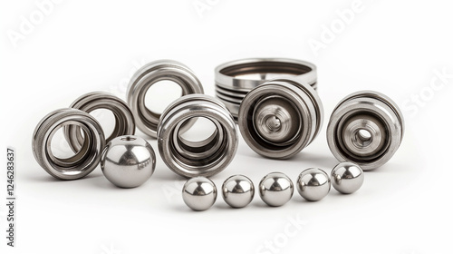 bearing, ball, ring, manufacturing, steel, stainless steel, industrial, closeup, isolated, white background, technical, engineering, technology, machinery, equipment, component, precision, high technology