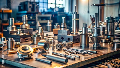 Precision-engineered metal components arranged on a workshop surface, showcasing various industrial parts and tools