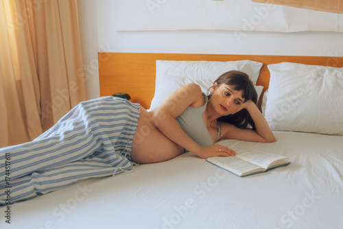 anticipation, baby, bed, bedchamber, belly, body, book, comfortable, cosy, expectant, female, home, indoor, leisure, lifestyle, maternal, maternity, mother, pajama, eltern, parenthood, portrait, pregnancy, pregnant, antenatal, reading, relaxation, tummy
