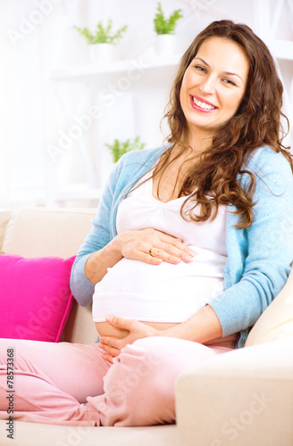 Pregnant smiling woman sitting on a sofa and caressing her belly
