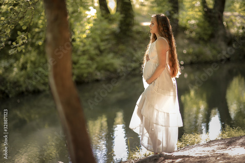 Pregnant woman in long white dress walks barefoot in the woods near the river.