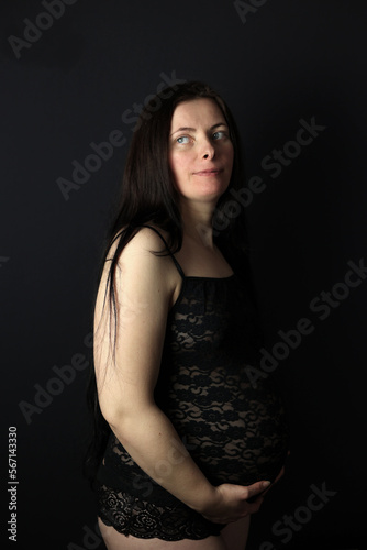 Pregnant woman in underwear. She is 30 weeks pregnant and has a big belly. Expecting a child. Third pregnancy