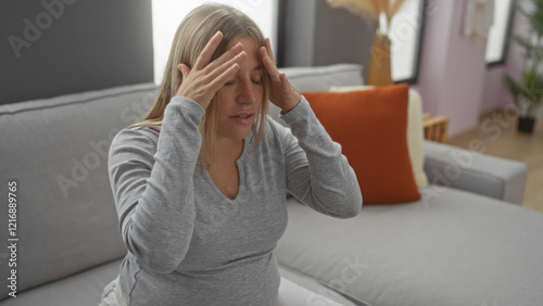 Pregnant woman sitting in a living room holds her head with a calm expression, capturing the serene atmosphere of a home setting.