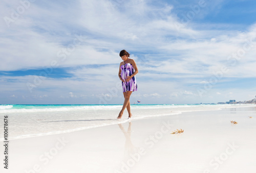 Pregnant woman walking on white beach