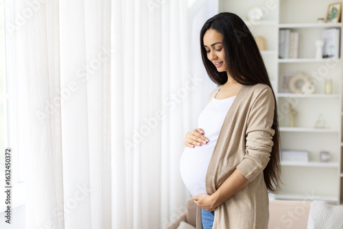 Pregnant young woman peacefully looking at belly while standing by the window. Calm atmosphere, cozy home and hopeful moment captured in bright natural lighting, copy space