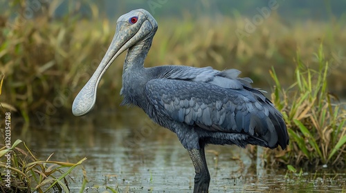 Prehistoric looking shoebill standing motionless in the marshlands of central Africa its massive beak poised for a lightning fast strike