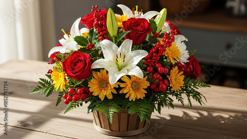 red rose, pine cone, red berry, realistic, commercial, gift, botanical, floristry, still life, seasonal, elegant, design, high-quality, winter, no people, premium