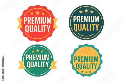 Premium quality badge collection. Set of colorful vector labels, stickers and seals. Guarantee and certified product stamp. Best choice award with ribbon and stars.