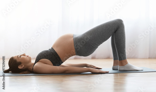 Prenatal Gymnastics. Young Pregnant Woman Training At Home, Doing Shoulder Bridge Exercise While Lying On Fitness Mat In Living Room, Expecting Lady Enjoying Healthy Lifestyle, Side View, Copy Space