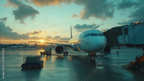 Preparation for next flight of airplane in airport. Fueling and loading cargo on the plane in airport terminal