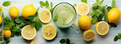 Preparation of Refreshing lemonade, whole and squeezed fruits, corrugated glasses, sprigs of mint, many details, and soft daylight.