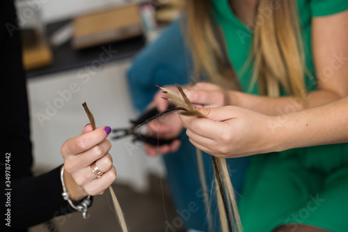 Preparing a strand of hair for extension. Hair and hair tools close-up.