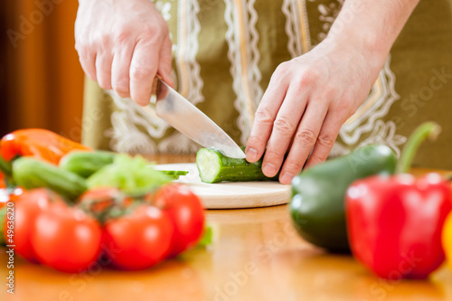 vegetable, cooking, food, fresh, hand, health food, kitchen, knife, table, apron, background, bright, clean, cucumber, cutting, dieting, freshness, green, health care, healthy, lifestyle, lunch, male, meal, nutriment, oil, olive oil, paprika, preparation, prepare, red, salad, seasonal, snack, tasty, tomatoes, vegetarian, vibrant, vitamin, high-coloured, wooden