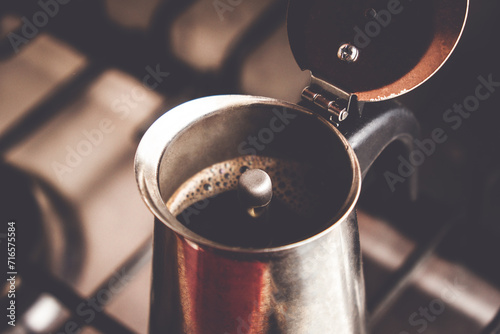 aluminium, barista, breakfast, brown, caffeine, cappuccino, closeup, coffee cup, coffeemaker, coffeepot, color image, dark, domestic life, drink, equipment, espresso, food, food and drink, geyser, hand, handle, home interior, hot drink, kettle, kitchen, lifestyle, machinery, making, metal, mocha, morning, mug, no people, non-alcoholic beverage, photo, roasted, scented, steel, stove, table