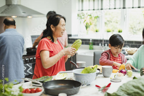 family, grandparent, grandmother, tradition, chinese food, holding, preparation, food and drink, ingredient, vegetable, talking, relaxation, enjoyment, simplicity, homemade, stir fry, salad, lettuce, cooking, freshness, vegetarian food, healthy eating, healthy lifestyle, lifestyle, hobby, role model, 60s, teamwork, togetherness, children, grandchild