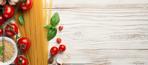 Prepping ingredients for a pasta dish with spaghetti, tomatoes, and garlic on a white wooden table, top view with ample copy space image.