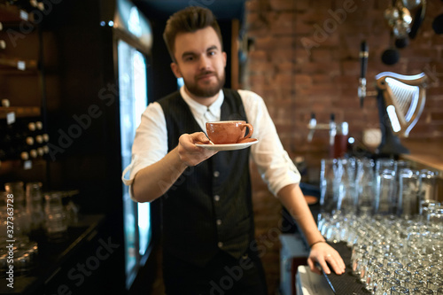 barista, cafes, hot drink, cup, eatery, shop, counter, drink, service, apron, business, caucasian, occupation, professional, waiter, young, adult, man, bar, work, attractive, indoor, owner, staff, employee, beverage, people, beauty, caffeine, modern, kitchen, barkeeper, arm, art, waitress, serving, happiness, looking, emotion, store, charming, standing, smile, uniform, refreshment, closed, male, person, vest