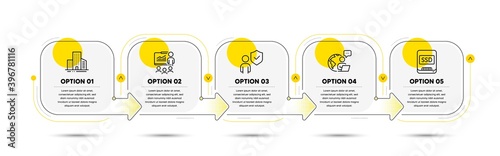 Presentation, Buildings and Security line icons set. Timeline process flowchart. Ssd sign. Business conference, City architecture, Body guard. Memory disk. Business set. Vector