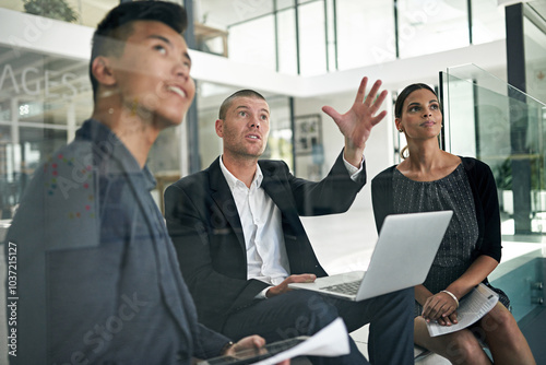 Presentation, discussion and business people in meeting with laptop, online report or thinking in office. Brainstorming, diversity and project manager communication with computer, growth and strategy