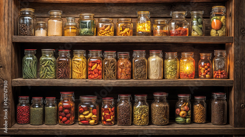 Preserved food stored in glass jars on wooden shelves, creating a rustic pantry scene